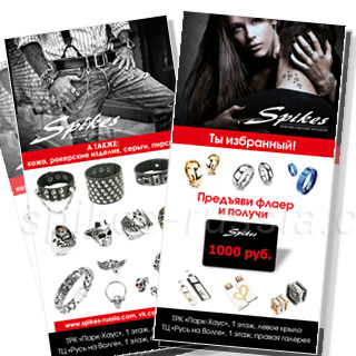 Рекламный лефлет Spikes "Получи 1000 руб". Лефлет для раздачи на мероприятиях. Предьявитель получает бонусную карту на 1000 руб. Лефлет в 4 полосы со сгибом. На лефлете изображены товары разных товарных категорий и стилей: парные украшения,украшения для НЕГО и для НЕЕ, рокерская атрибутика. Тираж от 5000 шт. Срок изготовления 7-14 дней.Полезная информация