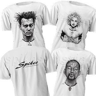Фирменные майки Spikes с изображением Джонни Деппа, Уилла Смита и Мадонны на груди и логотипом на спине. Размеры 42-48. Срок изготовления 7-14 дней.Полезная информация